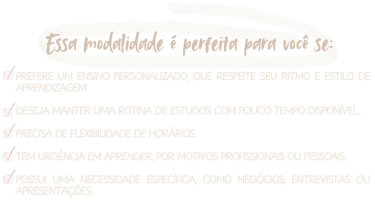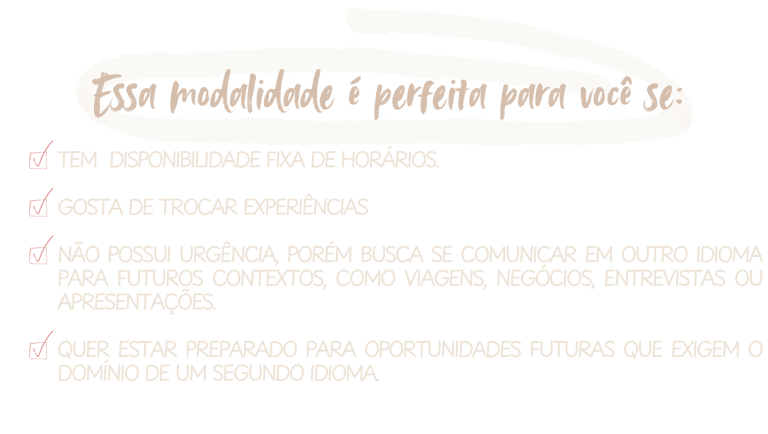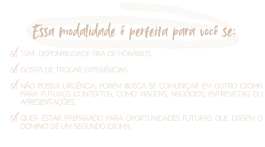 A aula é pensada para se adaptar ao ritmo, às necessidades e objetivos de cada aluno, garantindo um aprendizado personalizado. Desde o primeiro encontro, o aluno é incentivado a falar e se expressar em inglês, desenvolvendo confiança, fluidez e autonomia de forma natural e progressiva. Nossa metodologia prioriza resultados, sem perder de vista o conforto e a individualidade de quem aprende. Por isso, oferecemos total flexibilidade de agenda, com possibilidade de remanejamento de horários sempre que necessário, respeitando a rotina e os compromissos do aluno. As aulas podem ser online, presenciais ou hibridas, permitindo que você escolha a modalidade que melhor se encaixa no seu dia a dia.