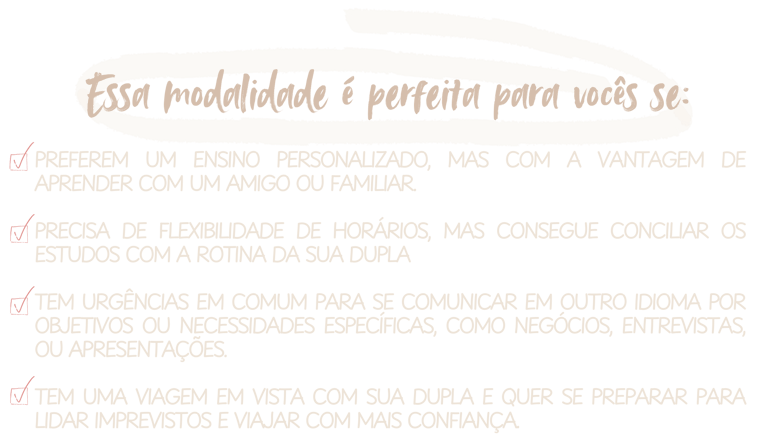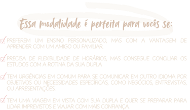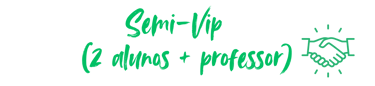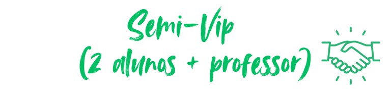 As aulas Semi VIP são realizadas exclusivamente em duplas ou trios, podendo ser com um amigo ou familiar. Aprender junto torna o processo mais leve, motivador e colaborativo, estimulando a participação, aumentando o engajamento e fortalecendo a confiança dos alunos durante as aulas. Essa modalidade oferece as mesmas vantagens do VIP, como ensino personalizado, acompanhamento próximo e foco nos objetivos individuais, porém com um valor mais acessível. O conteúdo e o material didático são ajustados ao nível de cada participante, favorecendo um progresso consistente. Contamos com total flexibilidade de agenda, com possibilidade de remanejamento de horários sempre que necessário, respeitando a rotina dos alunos. As aulas podem ser online, presenciais ou híbridas, permitindo que você escolha a modalidade que melhor se encaixa no seu dia a dia.